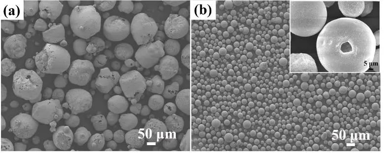 圖6 不同方法制備的YSZ空心顆粒:(a) 噴霧干燥法; (b) 噴霧干燥和等離子體燒結聯用Fig.6 YSZ hollow particles prepared by different methods: (a) spray drying process; (b) spray drying combined with thermal plasma sintering